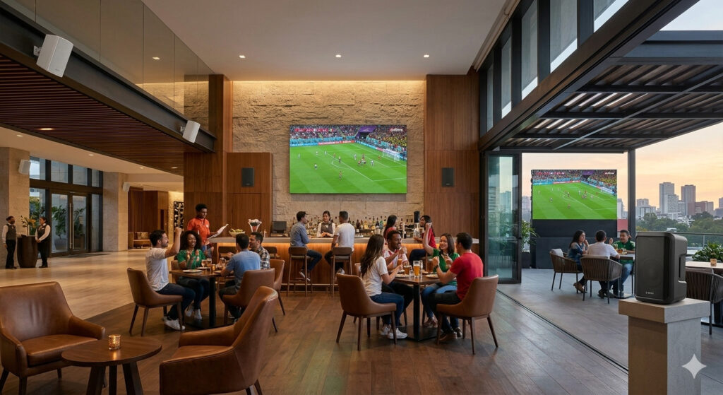 Durante el Mundial, muchos hoteles, restaurantes y bares consideran integrar pantallas y sistemas de audio como parte de la ambientación para acompañar la transmisión de los partidos. Estas soluciones suelen adoptarse desde un enfoque práctico, buscando que su presencia conviva con la experiencia habitual del lugar sin alterar su identidad.